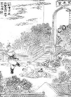 這一番,那猴王不分上下,使鐵棒東打两[当為“西”之誤]敵,更無一神可攩。只打到通明殿裏,此方是個大鬧。○人到通明之際,宜無有不知者矣。是為“知”字一轉。靈霄殿外。幸有佑聖真君的佐使王靈官執殿。他看大聖縱橫,掣金鞭近前攔住道:“潑猴何往!有吾在此,切莫猖狂!”這大聖不由分説,舉棒就打,那靈官鞭起相迎。兩個在靈霄殿前厮渾一處。好殺:
