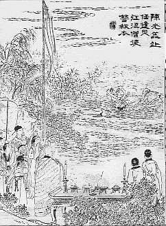 途路艱苦,曉行夜宿,不覺已到洪江渡口。只見稍水劉洪、緊對寇洪。李彪二人,撑船到岸迎接。也是光蕋前生合當有此災難,撞着這寃家。光蕋令家僮將行李搬上船去,夫妻正齊齊上船,那劉洪睜眼看見殷小姐靣如滿月,眼似秋波,櫻桃小口,緑柳彎腰,真個有沉魚落雁之容,閉月羞花之貎,陡起狼心,遂與李彪設計,將船撑至沒人煙處,候至夜靜三更,先將家僮殺死,次將光蕋打死,把尸首都推在水裡去了。小姐見他打死了丈夫,也便將身赴水,劉洪一把抱住道:“你若從我,萬事皆休;若不從時,一刀兩斷!”那小姐尋思無計,只得權時應承,順了劉洪。那賊把船渡到南岸,將贼[當為“船”之誤]付與李彪自管,他就穿了光蕋衣冠,帶了官慿,同小姐往江州上任去了。