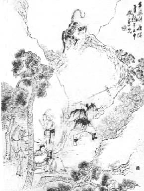 却説那行者、八戒,赶那虎下山坡,只見那虎跑倒了,塌伏在崖前,行者舉棒,儘力一打,轉振得自己手疼。八戒復築了一鈀,亦將鈀齒迸起,原來是一張虎皮,蓋着一塊臥虎石。行者大驚道:“不好了,不好了,中了他計也!”八戒道:“中他甚計?”行者道:“這個叫做‘金蟬脫殻計’,身雖在此,志不知又向何處?他將虎皮蓋在此,他却走了。我們且回去看看師父,莫遭毒手。”兩個急急轉來,早已不見了三藏。行者大呌如雷道:“怎的好!師父已被他擒去了。”八戒即便牽着馬,眼中滴淚道:“天那,天那!却往那里找尋!”知他志在流水,又在高山,這個風味難捉。行者抬着頭道:“莫哭,莫哭!一哭就挫了鋭氣。橫竪想只在此山,我們尋尋去來。”