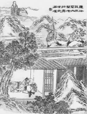 他郤牽了馬,挑了擔,出山凹,行上路口。此時漸漸黃昏,只聽得那路南山坡下,有犬吠之聲。二人停身觀看,乃是一家莊院,影影的有燈火光明。他兩箇也不管有路無路,漫草而行,直至那家門首,但見: