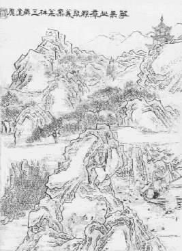 石崖高萬丈,山大接青霄。根連地厚,峯插天高。兩邊雜樹數千顆,前後藤纏百餘里。花映草稍風有影,水流雲竇月無根。倒木橫擔深澗,枯藤結掛光峯。石橋下,流滾滾清泉;臺座上,長明明白粉。遠觀一似三島天堂,近看有如蓬萊勝境。香松紫竹遶山溪,鴉鵲猿猴穿峻嶺。洞門外,有一來一往的走獸成行;樹林裏,有或出或入的飛禽作隊。青青香草秀,豔豔野花開。這所在分明是惡境,那長老晦氣撞將來。